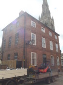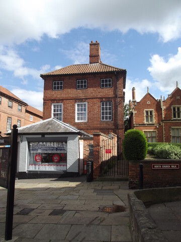 Former end pavilion to terrace, now house, and late C19 addition, now an opticians. 1766 and c1880. Built for Dr. Bernard Wilson, vicar of Newark. Brick with hipped pantile roof with single ridge stack. Plinth, first and second floor bands, modillion eaves. Windows have brick flat arches. 3 storeys; 4 x 3 windows. Four 12 pane sashes and above, four 6 pane sashes. Off-centre 6-panel door with overlight, flanked to left by a single 12 pane sash and to right by 2 similar sashes. Left return has 3 windows on each floor, all blanks, the ground floor left one being replaced by a door. Right return has has three 12 pane sashes, the right one blank, and above, three 6 pane sashes. Single storey C19 addition, colourwashed brick, has hipped slate roof. Glazed corner doorway with 2 single pane windows to left return and one to right. The adjoining terrace was demolished c1964. (EH)