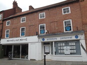 3 houses, now 2 shops. Late C18, refenestrated mid C19, altered late C20. Colourwashed brick with pantile roof. Dentillated eaves, 2 gable and single ridge stacks. 3 storeys; 7 window range of plain sashes with 3 blanks. Above, similar fenestration with smaller windows. Below, off-centre close boarded door flanked by late C20 shopfronts, all under continuous fascia. (EH)